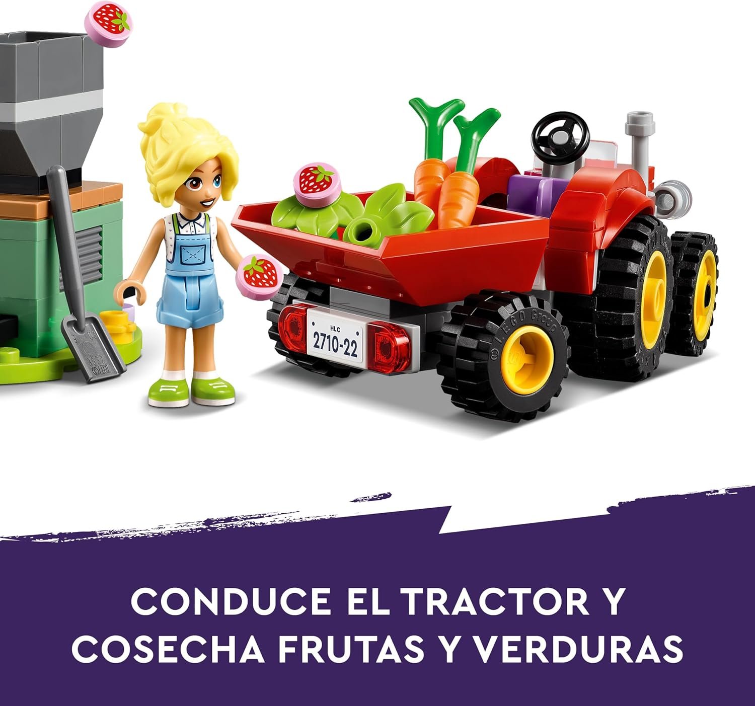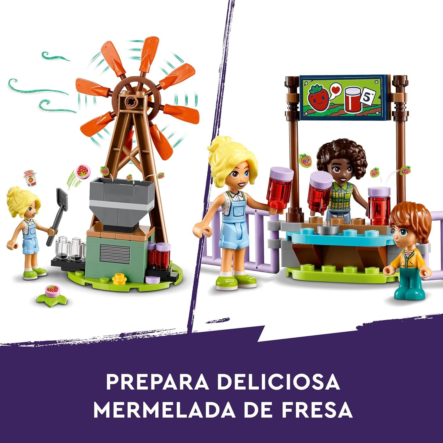 • Encárgate de las labores de la granja: fomenta el juego creativo con un juguete que permite a los niños interpretar que ayudan a los personajes de LEGO Friends a cosechar las verduras, cuidar de los animales y elaborar mermelada de fresa